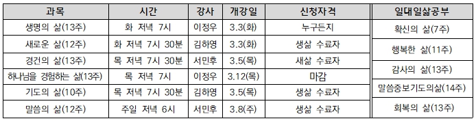 2. 삶공부 개강: 이번주부터 삶공부가 개강이 됩니다. *오늘 신청 마감 *삶공부 안내표 참고